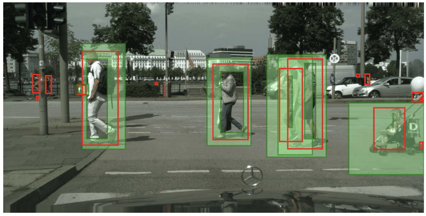So far we have released a pre-print; see below for a visualization of the results. Notice that for “typical” pedestrians, such as the second person from the left, the error bars (shown in green) are relatively tight around the bounding box (shown in red). The presence of “non-typical” objects will then increase the width of the error bands. For instance, the pedestrian on the far left is wearing a backpack, which inflates the right-side error bands. On the far right, a stroller is entering the field of view, and the bounding box contains only the child and not the stroller itself. Fortunately, our method recognizes that this box may be incorrect and increases the size of the error band to include the stroller. This would then result in a self-driving car navigating around the stroller and not just the child.